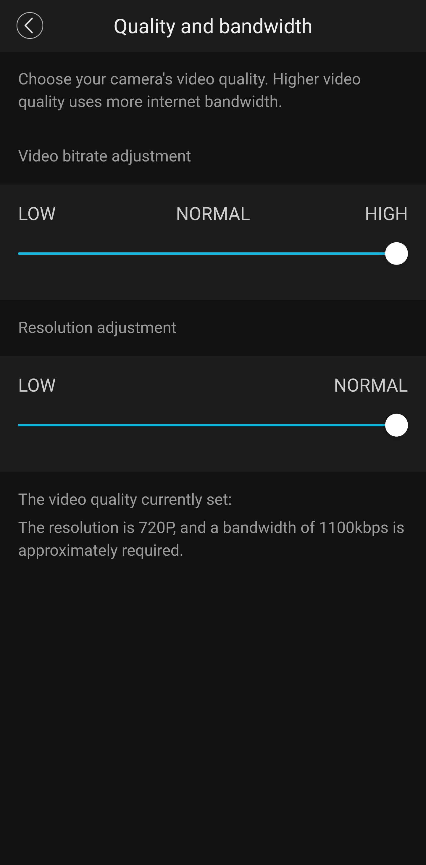 I have two a31 cameras. When I adjust the resolution in the "Quality and Bandwidth" section of the software to "Normal" (the highest setting) it says that the resolution is 720p and not 1080p or 2K (please see screenshot)